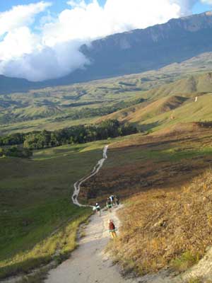 割と平坦な道を結構なペースで、ひたすら歩く。今日はまだまだ序の口らしい。途中、ロライマ山とクケナン山が見え隠れする。素敵な風景だ。そうそう、自転車に乗っているって言うと、体力あるから登山もへっちゃらだよね、と勘違いされるのだが、歩くって、自転車に乗るのと違う筋肉を使うのですよ。しかも、普段は荷物は自転車に搭載しているので、重い荷物を持って歩くなんてそうそうあることじゃなく・・・いやぁ、バックパック旅行より、荷物を持たないですむ自転車の方が実は楽なんじゃないのか、なんて思ったりして。