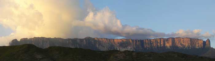 日が夕刻っぽい色合いになり、そろそろ疲れ果てたころ、リオテックという川の近くにあるキャンプ地が見えてきた。ちょっぴり高台になっていて、ロライマがくっきり見えるすばらしい場所。今日はここでテント・・・ってテントは?そう、テントは二人で一つということで、オイラとヤジータは一つのテントを事務所で借りたはずなのですが、お互いが持っているもんだと思って、二人とも持ってこなかったことが判明。おぉ、なんてこった。ガイドのホセに相談して、予備に持ってきていたテントを貸してもらうことに。うーん、こんな時のために予備にテントまで持ってきているとは、ポーターは大変ざんす。さて、電気なんて当然通っていないここ。日が暮れると周囲は真っ暗に。真っ暗な中、夕食のスパゲティ・・・うむむ、お世辞にもおいしいとはいいづらい・・・