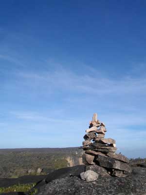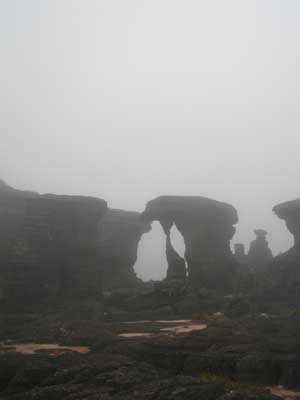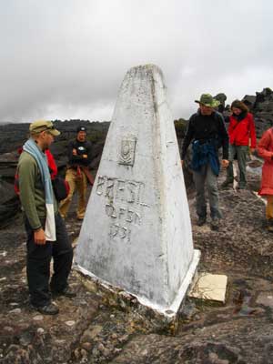 なんだか、そんなコムズカシイことを考えながら4時間歩いてました。そして、辿り着いたEl Fosoの洞穴滝。さらに奥に行くと、ベネズエラとブラジル、ギアナの三国の国境であるトリプル・ポイントが見えてきた。このトリプル・ポイントをグルッとまわり、ブラジルとギアナにも入国(したことになるのかな?)。何故この地点にトリプル・ポイントがあるのか、ブラジル人のジョーが説明してくれたのだが、言葉がわからずうまく理解できず。残念。そしてEl Fosoに戻って昼食を済ませ、帰路につく。4時間かけて歩いてきてこれかぁ・・・とちょっぴりガッカリ間を感じながら歩いていると、別グループのパーティに遭遇。彼らはこれからロライマの山頂の中でも最高点となるマーベリックという岩に行くとのこと。ホセが、時間があるし、行きたいメンバーは一緒に行ってきたら?と。すると皆「行く」と即答。歩きつかれたオイラは、正直え~まだ歩くの?と思ったが、ついて行くことに。