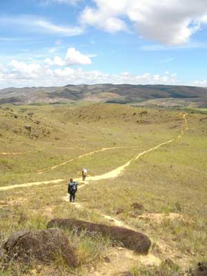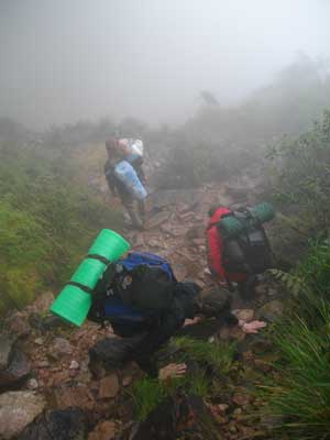 さて、今日はこのベースキャンプには泊まらず、一日目に泊まった場所まで一気に歩くのだ。ベースキャンプでしばらく休憩した後、リオテックに向け出発。ホセはどんどん先に進む。オイラ達のことはあまり気にしていないようだ。マイペースなガイドさんなんです。そうそう、書き忘れてましたが、一緒にロライマに登ったメンバーについて、少々メモを・・・アイルランドのキャロルは一日目から、歩き中、ず~っとしゃべっている。このおしゃべりパワーはどこからくるのか不思議になるくらいのしゃべりっぷり。そして、ブラジル人カップルのジョーとジュリアンの仲のいいこと。凸凹コンビのお二人なんですが、なんだか周囲も暖かくさせてくれるいい関係でした。そして、オイラに一番気を使ってくれたサンダーは、歩くの大好き男。一番活発に動き回ってました。ちなみに、サンダーもオイラに負けない食べっぷり。シウダー・ボリバールから一緒だったヤジータは、ちょっぴり自分中心なマイペース人間。たまにイラッとさせる言動をするんですが、気さくでいいヤツでした。最後に、ポーターのチグリ。実は一番大変じゃなかったのかな・・・メンバーの食料をはじめ、重い荷物をしょって後ろからついてきてくれて・・・スペイン語しかしゃべらないホセの通訳だったり、疲れたホセの代わりに先頭で誘導したり、ご苦労様でした。
