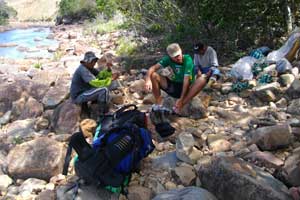 川に出たので、昼休憩に。久々に水浴び。振り返ると今朝まで山頂に居たロライマ山が遠くに見える・・・それにしても、シャワーは川で、食事はオイルストーブでパスタかスープを自炊、寝るのはテント、そしてトイレは野で、と、うむむ・・・このワイルドさは、自転車旅行で最初に抱いていたイメージそのものではないか。普段の旅もこんな生活をするべきなのかもしれないケド・・・都会人の習性を捨てきれないオイラ・・・