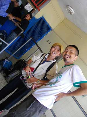 と呼ぶ、久々に聞く日本語の声がするではありませんか。な、なんとそこには、グァテマラのタカハウスでお別れして以来、ほぼ3ヶ月ぶりとなるShoさんと、タカヒロさん・マチエさん夫妻の姿が!中米、南米と南へ下るコースということでは共通していたので、またいつか会いましょうと、HPやらメールでやり取りはしていたんですが、実際、移動のペースが違うんで、ある程度長期滞在をするような宿でもないと、再会は難しいのかなぁと思っていたんです。それが、なんと、この国境で再会を果たせるなんて!3人はこれからベネズエラ入り。オイラが登っていたロライマへ向かうそうです。そしてオイラは、ベネズエラ出。3人が泊まっていたHostal San Blasへ向かうわけです。ちょうど一直線の入れ違いなんで、どこかですれ違うはずではあるのですが、お互い車中ではなく、国境の列でぶつかるなんて。いやぁ、偶然というかなんというか、こういう巡り合わせってあるんですねぇ。面白い。なんだか、妙に嬉しくなっちゃいました。とはいえ、国境でのすれ違い短時間再会。またゆっくりどこかで会いたいです、お三方とは。