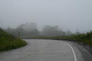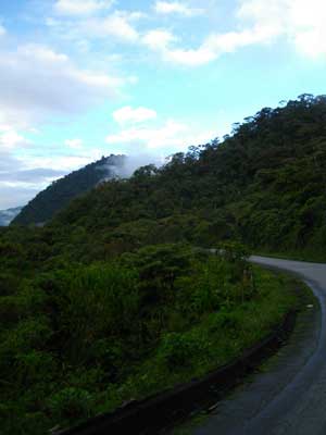 目指すTenaという町は、アマゾンの入り口となる町。500mくらいの高さにあるらしいので、今日はずっと下りかな、と思っていたら、そんな単純な道ではなかった。確かにしばらく下りが続いたのだが、途中から再び山上り。しかも、この山には雨雲が覆いかぶさっていて・・・それまで晴れていたのに、突然雨に切り替わった。まぁ局所的な雨で、ちょっと進めば止むでしょう、と思い、雨宿りせず進んだのだが、そんな甘くはなかった。その後しばらく雨中走行するはめに。しかも、最初は霧雨のような雨だったのに、途中から土砂降りに。それにしても、最近は、以前ほど雨中走行が嫌ではなくなってきた。雨ガッパ2つと、ビニール袋を駆使して、荷物を濡れないようにしたからだ。自分が濡れるより、荷物が水浸しになるほうが、ダメージがデカイんです。とは言うものの、自分が濡れるのもやっぱりキツい。まだまだ高い位置にある山の中。雨に濡れたオイラの体は、冷たい風にさらされ・・・寒さで体が震えてきた。い、いかん、このままでは風邪をひいてしまう、と思っていたところ、Narupaという町に出た。レストランを見つけ、昼食をオーダー。すぐに出てきた暖かいソパのおいしかったこと!体が温って、生き返ったのでした。