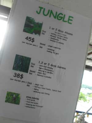 その後、オーナーのミシェルさんに、船でのペルー入国方法について、聞いてみた。実は、ペルーへの入国、このままNapo川を下って、入っちゃおうかと考えているところなんです。ペルーのイキトスまでの船便を聞いたところ、イキトス行きの船は、コカという町からしか出ていないとのこと。コカは、今日、昼飯を食べた町にあった分かれ道の別の道を行ったところにある町。う~む、戻らねばならないのか・・・値段はイキトスまでで、大体200$くらいじゃないかと。値段はまぁいいとして、めんどくさそうなのが、国境付近。早口のスペイン語で説明されたので、微妙によくわからなかったのだが、何度か船を乗り換えなければならないみたいなのだ。どうしよっかなぁ・・・まぁ、明日からしばらく、Misahualliというジャングル村へ行く予定。ジャングルで遊んでから考えるとしよう。