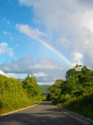 4つくらいの山を越え、あぁ、いい加減にもう疲れた、と思いながら、ふと顔を上げると、今まで見た中で一番クッキリとした大きな虹が、目の前にあるではないですか。しかもこれから進む道を包むように・・・あまりに綺麗な七色の架け橋に、しばし呆然とした後、なんだか、山越えお疲れさんと祝福をされているような気分で、この虹のアーチをくぐったのでした。