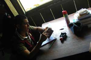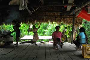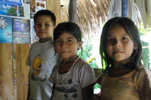 昼食を終え、Pantojaを出発。またしばらく川下り。川下り途中で、川で暮らす人たちの家々を二軒ほど訪問。最初に寄ったのは、米を作っている農家。川沿いで稲を作っている。この川沿いの稲畑、日本の田んぼというイメージではなく、単なる草むらってイメージなんです。最初案内された時、「これ、アロス(米)だよ」ってサンドロに言われるまで、気づかなかったくらい。雑然と生えている稲畑で、ちょうど収穫作業中。家族総動員で稲刈りをしていました。次に寄ったのが、子供達がいっぱいいる大家族の家。お母さんとおばあちゃんと子供5人にもてなしてもらいまして。お椀にタップリと注がれた、ジャングルジュースをごちそうになっちゃいました。ジャングルジュースとは、ユカを液状にしたもので、味は白酒に似ている感じ、ちなみに、アルコール分はないそうです。そして、子供達が人懐っこくてかわいかった。カメラを取り出すと、モノ珍しそうに寄ってくるのでした。