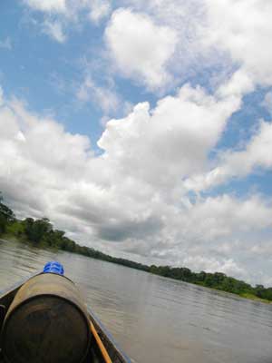 さて、お腹の調子は、微妙に不安があるものの、なんとなくよい。8時にさぁ出発。晴れた空の下、たゆたゆと流れる茶色いナポ川をゆったりとカヌーボートが進んでいく。川の水が茶色いのは木からでる樹液の色らしいのだが、近くで見ると意外と汚れている。得体の知れない泡なんか浮いちゃってて。まぁこの程度の汚れは、人々の生活川なのだからしょうがないのかもしれない。体洗いはもちろん、洗濯やら、食器洗いやら、ごみ捨てやら、ここでは、生活のあらゆることが川と結びついている。