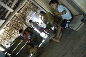 高床式の茅葺家、観光客用に用意されてものではなく、現地の人がそのまま生活している家の中は、生活臭にあふれ、オイラとしては、ワクワクしてしまいまして。でっかいカマドが、生活の中心点になっていて、そこに家族がいつも集まっている。このカマドではなぜか、常に鍋が噴いている。その奥にはでっかい鍋がいくつも転がっていて、さらに、むき出しの食料がドンと山積み。高床の下の地面には、数十匹のニワトリやら、豚がせわしなく動いている。そして、ここの家のパワフルおかあさん、カマドにくべる薪がなくなったので、スコールの中だというのに庭に出て、でっかい斧を振りかざし、薪割りをはじめた。雨に濡れてシャツが透けちゃってますよ、おかあさん!って全然気にしていない様子。さらに、でっかいポリバケツを頭に乗せ、川まで水汲み・・・この水が台所用水となる。食器を洗ったりなんなりと・・・歯を磨く水もこの川の水を使っていたのでした。