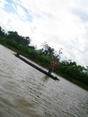 ちなみに、アマゾン川には大きな支流だけで200ほどあり、長さが1600kmを超える支流が17もある。ナポ川は、そんなアマゾン川の大きな支流のひとつ。アマゾンの源流の一つと呼ばれているマラニョン川の水源は、ペルー北西のアンデス山中にある。このマラニョン川とウカヤリ川が合流する点から下流をアマゾン川と普通呼んでいる。で、このマラニョン川とウカヤリ川が合流する地点の近くにあるのが、イキトス。そして、イキトスの下流で、このナポ川はアマゾン川に合流する。そう、いま行っている川下りは、正確に言えば、アマゾン川下りツアーではなく、<アマゾン川へ向かっての川下りツアー>なのだ。