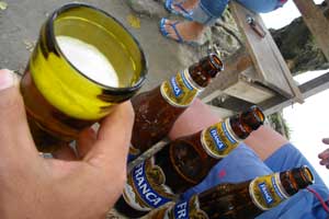 さて、到着して早々、サンドロの知り合いの人たちが集まってきたので、無事到着祝いも兼ねて、ビールで乾杯。こちらのビールの飲み方は面白く、一つのコップとビール瓶を順々に渡していく。渡された人は自分の好きなだけコップに次飲みほし、次の人に回す。これ、皆に回るから、一人の飲む量は少ないんじゃないと思うでしょ。オイラも最初はそう思ってました。確かに、ビール瓶1本2本で終わるのなら、そうなんですが・・・空いたら次々にビール瓶が来るのです。永遠に回り続けるコップとビール・・・気づいた時にはシコタマ飲みすぎていて、足元フラフラ。宿の部屋でちょっと休んできますと言い残しつつ部屋に戻ったのはいいが、疲れと酔いで、いつの間にか寝てしまっていたのでした。