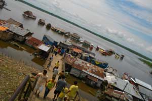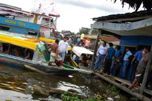 船は猛スピードでアマゾン川を進む。アマゾン川は、ヨーロッパのすべての川の水を合わせた以上の水量を大西洋へ注ぎこんでいるという。これは、地球上のすべての淡水の四分の一にもなるらしい。いやぁ、スゴイ川です、アマゾン川。このアマゾン川を見ながら、オメテ君が「ヨシ、ウェルカム・トゥ・アマゾンリバー」とオイラに向かって叫ぶ。はぁ、とりあえず難関を乗り越えたので、無事Iquitosに行けそうだとホッとしたのもつかの間、到着したIquitosの港は、細い木の渡し橋と長い階段・・・「さて、荷物を運ぼうか」と、オイラの荷物を持って進み始めたオメテ君とミッシェル君の後姿のなんとかっこよかったこと。すいません、荷物が多くて。ホント、ホントに感謝です。とにかく、乗り継ぎ時の荷物運びは面倒なんです。重い荷物を担がなきゃいけない辛さはもちろん、無くなりはしないかと気を張ってないといけないし・・・途中何度もシャッターを切りたい場面に遭遇したのに、写真を撮る余裕もないほど気持ち的には、テンパッていたのでした。