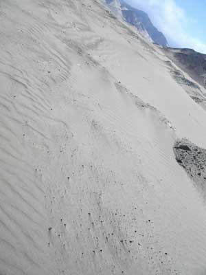 宿の隣がレストランっぽいのだが、すでに閉まっている様子。店の前をウロウロしていたら、レストランの人と思われるオバちゃんが話しかけてきた。「食事かい?もう閉めちゃったケド、カブリートならまだあるから出せるわよ」と。カブリートがなんだかよく分からなかったが、この際、食べ物ならなんでもいいです、と、お願いすることに。出てきた食事は、焼いた肉にソースをかけたもの。アロスとユカ付き。おぉ、十分すぎる食事です、美味いです、と猛烈な勢いで食べる。食べ終わって、しばらくオバちゃんと談笑。途中、売店に寄って、明日の分の水を購入してから、宿に戻ると、受付の所で、さっきのレストランのオバちゃん、カブリートが盛り付けられたお皿を持って、立っているではないですか。「あんた、まだお腹が空いているんでしょ。これ、今日の最後の残りなんだけど、サービスしてあげるわ」と。あぁ、ペルーでこんなに皆さんに親切にしていただけちゃって・・・イイのかしら?