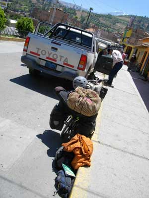 トラックは、ワラスまで行くという。おほっ、このままワラスまで連れて行ってもらうのは楽でいいなぁ、それもアリか、と思ったのですが、この先にあるYungayからの道は自転車で走ると気持ちいいよぉと聞いていたので、とにかくYungayまで乗せていってもらうことにしたのであった。荷台に自転車と共に乗り、ガタガタ道を進む。しばらくして、舗装道路に切り替わった。そして本日目標地としていたCarazを通過して、Yungayへ。自転車を下ろしてもらい、オジさん5人衆とお別れの握手。ホント助かりました。
