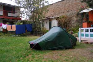そして、到着したHuarazは・・・思った以上の都会でした。Yungay、Carhuazがこじんまりとした、アットホームな感じの町だったので、それをもうちょっと大きくした感じかなぁと思っていたんですが、道の脇にはアーケードモールがあり、電気製品やら衣料品やらの店がズラリと並んでいる。とりあえず、町探索は後にして、宿探しから。目指す宿は、トルヒーヨで一緒だったアメリが、「ワラスに行ったら、この宿がお勧めよ」と教えてくれたJo's Place。町外れにあり、静かで感じのよい宿らしい。到着して、入ってみると・・・確かに庭が広く、緑豊かでいい感じ。ドミの値段を聞くと15ペソとのこと。しかも、2段ベッドで上の段しか空いていない。上の段はあまり好きではないオイラ、「庭にキャンプするといくらですか?」と聞いてみた。すると、ドミの半額以下の7ペソ。Huarazにはしばらく滞在するつもりだったので、この値段は嬉しい。というワケで、ここHuarazではキャンプで過ごすことにしたのでした。