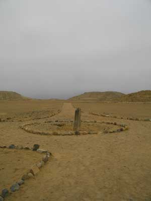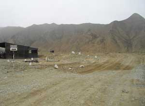 それにしても、HuauraからのCaralへの道、思った以上にヒドイ道。石砂利のほかに砂地が続くゾーンもあるし、山を越え谷を超え、アップダウンが激しいのだ。そして周囲は殺風景だし、霧に包まれているし、人どころか、車すらすれ違わない。だんだん心細くなってきたところで、ようやく<Ciudad Sagrada de Caral>と書かれた碑が見えてきた。そしてこの碑を超えると、遺跡の入り口が・・・30kmの道を4時間ほどかけ、ようやく到着したのでした。