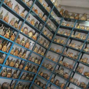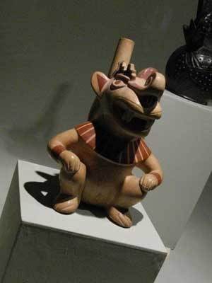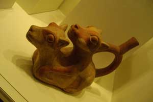 そして、ここラルコ博物館の最大の見ものである<エロチックギャラリー>へ。この博物館、遺物がホントによく分類されていて、感心するんですが・・・おそらくラルコさんの趣味なんでしょう、ここには、なんと、エロティックな土器ばかりを集めた、未成年入場不可の別館があるんです。ここには、性器を表現したモノ、性交渉中の男女、繁殖行為中の動物、なぜか自慰行為をする骸骨・・・などなど、性やら生に関して表現された土器がこれでもか、というくらい並べられていまして。う~ん、これらは、生活描写の一端として風景画的なモノとして作られてモノなのか、それとも、今で言うAVやらエロ本のように、それを見て興奮するためのメディアとして作られたモノだったのか・・・結構アブノーマルな行為を表現したモノとかあったので、作り手の妄想を形にした興奮メディア、として作られたモノのような気もするのですが・・・現代人のオイラが見ても、ムラムラとはしなかったのでした。