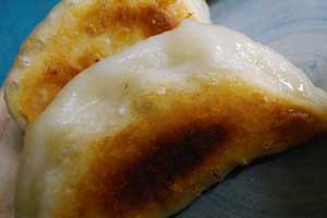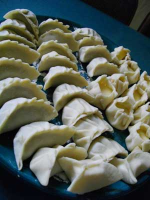 皮材を寝かしている間に、具を作り始める。白菜、葱、ニラ、ショウガを全てみじん切り。ひたすら細かくみじん切り。いっつも、この作業に時間がかかってしまうのです。餃子を作る時、しばらく台所に居座ることになり、「Yoshiはいっつもコシナ(台所)に居るね」なんて言われたりもするのですが、これはみじん切り作業のせい。今日は、さらに、いつもに比べ、大量の野菜をみじん切るため、時間も倍以上かかってしまった。時計を見たらなんと、もう12時。パーティはお昼から。ちょいと気持ちをスピードアップして、具を作成。寝かしておいた皮材をもういちどコネ直し、皮作り開始。ここで、最初のお客リョウコさんが到着。ご挨拶をして・・・具を包むのを手伝ってもらっちゃいました。オイラがノシ棒で伸ばした皮をリョウコさんに渡し、それをリョウコさんが包む。見事な連係プレーで、次々と餃子が出来ていく。そして出来上がった餃子64個。最後の方は具が足りなくなって、チーズを包んでチーズ餃子を作成。包みは完全にリョウコさんにお任せしていたら、チーズ餃子がすごくかわいい包みに。いやぁ、素敵。この包み方、次回真似させていただきます。