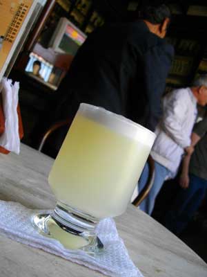 さて、今日のお昼、ペルーに来てもう2ヶ月になるというのに、噂の名物ピスコサワーなるものをまだ飲んでいなかったオイラ、「ピスコが飲めるお店があるんだけど」というナオコさんの言葉に反応。以前行った国立人類学考古学博物館の近くにあるというお店に向かうことにしたのでした。バスに乗って、1時間ほど市内をグルグル回って、Brazil通りへ。目指すお店は、国立人類学考古学博物館の裏にありました。中に入ると、壁一面がショーウィンドウになっていて、その中には、いろんなお酒が並べられていて、ちょっと前の時代のバーの雰囲気漂うおしゃれなお店。入り口から洩れてくる光で明るく照らされているテーブルに座りまして。早速ピスコサワーと、食べ物をオーダー。