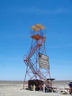<Museo Maria Reiche>を後にして、上空でセスナ機がブンブン飛んでいる中、走ること20分。見えてきました、鉄柱で組まれた高さ20mほどの展望台。ここ、ここなんです!11年前、ペルー・ボリビア旅行のツアーに参加して、セスナに乗ってナスカの地上絵を見たのですが、その時、真下にパンアメリカンが見えて、しかも、地上絵のすぐ傍を走っているということに驚きまして。空から見る地上絵に感激した後、心の中にムクムクと、あのパンアメリカンから地上絵を見てみたい、という野望というか、想いが沸き起こってしまったのでした。その想いは、この旅に出る時に、当然のごとく強く思い出されまして。<パンアメリカン沿いの展望台からナスカの地上絵を見る>ということは、ペルーで実現する目標の一つとなったのでした。