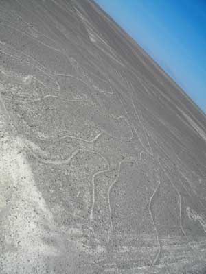 そんな展望台が、目の前に・・・あぁ、なんか体が震えてきます。展望台下に自転車を停め、1ソル払って、階段を登る・・・ヤバイ、こんなに期待しちゃったら、きっとガッカリすることになる、と思いながらも、期待を止めることは出来ず、ドキドキしながら、階段を登るのでした。そして辿り着いた展望台のトップ。そこから見晴らした景色は・・・いやぁ、感動しました。地上絵に感動したのか、11年越しの悲願が達成できたことに感動したのかよく分かりませんが、気持ちがたかぶり、思わず涙がポロリです。潤んだ目の前に<木>と<手>が見えます。地上からはただの凸凹にしか見えないのに、たった20m登っただけで、輪郭を現す地上絵。いやぁ、ホントに紀元前800~紀元後200年頃に描かれたモノなんでしょうか?見事すぎです。誰が何のためにというのは謎に包まれたままの地上絵ですが、これは、きっと、当時の測量士の技術を競うコンテストの跡なんじゃないかなぁと思うんですよ。王様が落書きしたハチドリとかコンドルを地表に100倍したスケールで描いてみなさいコンテスト。出来上がりはきっとやぐらを組んで、この展望台みたいなモノを作り、その上から眺めて批評していたんじゃないのかなぁ。
