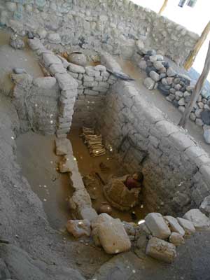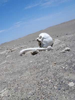 そして、ちょうど7km行った所に、遺跡の入場口を発見。ツアー客を運んできたと思われるタクシーおよびバンの運転手の人たちが「おぉ!自転車で来たのか?」と驚きの声をあげ、オイラの到着を迎えてくれたのであった。自転車を脇に停め、5ソル支払い、いざ遺跡へ。ここ、発掘されたお墓跡に、ミイラや白骨や遺物をきれいにならべて展示している、ある意味リアルミュージアム。くぼんだ穴の中を見ると、まるでそこにたたずんでいるように見えるミイラが居るのです。ペルーに入って、数多くのミイラを見慣れてしまったオイラは、コレを見ても、微妙に心が動かなかったのですが・・・このお墓跡周辺を見渡すと、荒野の大地に、白骨がゴロゴロ転がっていまして。この風景にグッときました。荒涼としたナスカの大地に真っ白な白骨・・・なんか妙にマッチした、違和感のないこの光景。白骨がグロテスクなオーラを発しておらず、風景の一部として溶け込んでいる様子に、不思議な感覚を覚えたのでした。