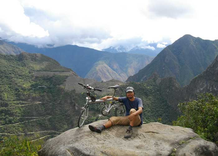 そして、ようやく、頂上のレインボーの旗が目の前に。やったぁ~頂上だ!目の前には、ハイラムビンガムロードと、マチュピチュ遺跡が。真横からマチュピチュを見るという珍しい構図。この珍しい角度からのマチュピチュが新鮮だったからなのか、重い荷物を担いで頂上まで来たという達成感が満ちてきたからなのか、とにかく、なんだか妙なテンションになってきたのでした。ウキウキしながら、BD-1を広げるオイラの姿を見て、先に頂上に居たドイツ人のおじさんおばさん達は、信じられないという目でオイラの自転車を見る。「これ、メイド・イン・ジャーメニーですよ」と話のキッカケを作り、しばし雑談。で、さて、どこで写真を撮ろうかとウロウロしていたら、写真を撮ってもらおうと思っていたドイツの人たちが、「アディオス!」と言いながら、下山してしまった。おぉ、セルフで撮るしかないのか、と思ったところ、ちょうど、アラスカから旅しているというおじさんが登ってきた。ラッキー!ベストポジションと思われる、台のようになっている石の上に自転車を乗せ、マチュピチュをバックに、記念撮影<カシャッ!>。記念撮影嫌いなオイラも、マチュピチュだけはなんとしても撮っておきたかったんです。BD-1と一緒に。不可能かと思って一度は諦めていた夢だっただけに、実現できて、ホント幸せです。ふ~、これで、今回マチュピチュに来た目的はほぼ達成されたって感じ。もう、明日のマチュピチュ遺跡巡りは、オマケです(笑)、なんて思うくらい、今日の記念撮影は念願であり、夢であり、執念だったのでした。