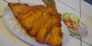 さて、Pomataという町で昼食を食べようかなぁと思っていたのだが、町がちょっと上ったところにあったので、断念。国境で食べるか、と思って自転車を進めたところ、左手になにやらトラックが数台停まっている場所があった。トラックが数台止まっているところは、洗車場か、おいしい食事処かある場所、というのがオイラが見つけた旅の法則。行ってみると、どうやら食事処らしい。食事処といっても、レストラン的な雰囲気でもなく、ただ机が並べられているだけの空間で・・・インディヘナのオバちゃんやオネエちゃんが、構えているというメルカド的な雰囲気の場所だった。で、ここ、チチカカ湖で捕れたトゥルーチャをその場で揚げて出してくれる様子。早速、椅子に座って、トゥルーチャ定食を一つオーダー。二枚におろしたトゥルーチャに、なにやら調味料をまぶし、油でジャーと揚げる。米、芋、サラダをまぶした皿の上に、揚げたトゥルーチャをドンと乗せ出来上がり。パクつくと・・・旨い!抜群に旨い。ワラスで食べたトゥルーチャの何倍も旨かった。食べている間に、店のオバちゃんやら、トラックの運転手やらに「どこまで行くんだ?」「ペルーは好きか?」とか聞かれまくり。もうちょっと落ち着いて、このおいしいトゥルーチャを堪能したかったんですケド・・・