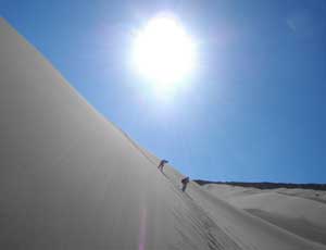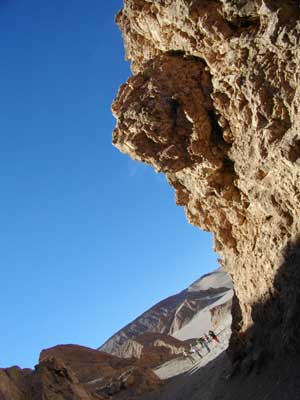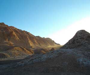 夕刻オフィスを再び訪れると、チリ人の夫婦、フランス人カップル、チリ人の女の子二人がいました。ガイドと運転手合わせて全9人。9人にしては大きすぎる巨大バスに乗り込み出発。町を出ると、すぐに風景が変わってきた。ゴツゴツした岩肌。いやぁ早速テンションあがります。バスは、直接月の谷には向かわず、まず、Valle de la Muerte、デスバレーと呼ばれる谷へ。未舗装道に入りしばらく走ったのですが、途中でバスが停まった。ここから歩いて谷を巡るとのこと。そして上り始めたのは、いきなり砂山。ズブズブと足が埋まり、歩きにくいったらありゃしないのですが・・・これが・・・楽しいんです。そして、上りきったところから見た景色が・・・スゴカッタ。谷底はゴツゴツしていて、ところどころに、巨大な恐竜の背骨が埋まっているんではないか?と思わせられるような、奇妙な骨型の盛り上がりなんてあって。しばらくここでボーっと谷底を眺めた後、移動。谷底は結構深いんですが・・・なんとこれからこの谷底に降りるというではないですか。どうやって降りるのかと思っていたら・・・砂地である斜面を駆け下りる、と。フフフ、なんてファニーなツアーなんでしょう。靴の中にタップリと砂を入れながら走り降りましたよ、谷底まで。