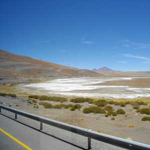 2,500mほどのサンペドロ・デ・アタカマから、一気に4,500mまであがる。来る時に下ってきた道だ。バスだと楽~に上がっていってるんだけど、この道、自転車だとキツイなぁなんて思いながらバスに揺られる。バスに乗っていても、自転車で走るとどうかなぁと、ついつい頭の中でシュミレートしてしまう。職業病ですな、これ。ちなみに、席は一番前。アンデスの絶景が目の前に見える席を確保したんです。バスのルートは、想像どおり、アンデスの絶景。そして、聞いていたとおり、周囲には何も無い。途中、カップルで走っているチャリダーを見かけた。オイラは諦めたケド、がんばってください。