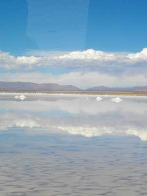 そんな状況でGPSと地図とにらめっこをしていたら、「サラール!」という声があがった。左手の方向を見ると、塩湖が。そして、なんと、ここの塩湖、水が溜まって見事な鏡張りになっているじゃないですか!こ、こんなところで、鏡張り塩湖が見れるなんて・・・あまりにも見事だったため、「ここで降ろしてください!」と言おうと思ったのですが、一応、ワガママを言って、バスの通常の降り場所ではない<プルママルカ>という町で降ろしてもらうようにしていた手前、言い出せなかったのでした・・・そう、このバスは、フフイもしくはサルタという街に行くバスなんです。両方ともオイラは訪れる予定の街なんですが、その前にある<プルママルカ>という町にどうしても行ってみたくて。通り道だし、オイラはそこで降ろしてもらうように頼んでおいたのです(ちなみに、料金はどこで降りても同じ)。で、この鏡張り塩湖からプルママルカまで70km弱。う~む、この塩湖は、ぜひ目の前で見たいなぁ・・・プルママルカまで行ってから、自転車で戻ってみるか、と思い始めたのであった。プルママルカは一泊だけして、フフイに向かう予定だったんですが、プルママルカに二泊して、中一日は、鏡張り塩湖へ自転車で向かう日にしようと。臨機応変に予定を変更できるのは、フリーな旅のいいところです。なんて思っていたのですが、塩湖の高度が3500mほど。そこからバスはグングン上る。そして、4170mを通過。そしてそこから今度はグングン下がる。そして到着したプルママルカの高度は2,500m。おぉぉ、自転車で向かうのはいいが、1,600m上って600m降りて、帰りに600m上って1,600m降りなきゃいけないのか・・・しかも往復の距離にすると140km弱。これって、一日で行って帰ってこれるのか?と不安になったのでした。