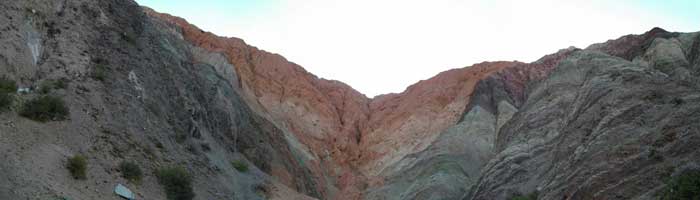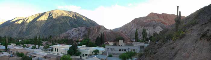 とりあえず、プルママルカに到着したので、宿を探しに町をウロウロ。さすが観光地だけあって、宿が高い。3軒ほどはしごして、ドミで25ペソの宿を見つけ、ここに泊まることにしたのであった。荷物を入れ、シャワーを浴びた後、早速外へ。ここ、プルママルカは、ウマワカ渓谷という南米のグランドキャニオンと言われている渓谷沿いにある町。んでもって、このプルママルカ周辺にある山々は様々な鉱物によって成り立っているため、いろんな色の山を眺めることができるんです。別名七色の渓谷って呼ばれている場所もあるんですよ。奇岩、渓谷好きのオイラとしては、はずせない場所でして。早速七色の山々が見れるミラドールへと繰り出したのでした。町の裏に山がそびえているので、町からもそれらの山々を見ることができるのですが、ちょっと家々が邪魔。ミラドールまで行くと・・・いやぁ感動でした。こんなにも色彩豊かな山々が見れるなんて。かなりワクワクする風景だったのでした。