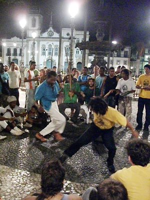 夜、旧市街セントロの広場で、カポエイラのストリートファイトが行われるというので、皆で見に行くことになった。広場へ向かうと聞こえてきたビリンバウの音。カポエイラというのは、足技をメインにした格闘技。黒人が奴隷として扱われていた期間、唯一自由に使えた足を使って支配層に立ち向かうために編み出されたという。しかも、鍛錬時に、支配層の人たちに、格闘技と思わせないために、舞踊の要素を取り入れ、ダンスと見なされるようにしたとか。そんな背景があるため、カポエイラは、舞踊と格闘技が混じった独特のモノになっているようです。