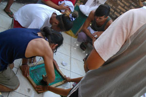 デビューパレードに向けて、前日の今日は、猛練習・・・かと思いきや、実は、ボンフィン向けの練習は昨日1時間ほどやっただけ。今日は、楽器をそろえたり、衣装を作ったりとコマゴマとした作業をする日となったのでした。夕刻、カオリさんたちが買ってきてくれたTシャツやらタンクトップに、<ナタカトシア>のマーク入れ作業。リョウチンがデザインして作ってくれたというシルクスクリーンに塗料をのせ、シャツにプリント。いやぁ、なんか、このノリ、高校の体育祭か文化祭の前夜祭を思い出しますな。二度と味わうことはないだろうなぁと思っていた楽しい時間を再び体験できて、なんだかとても幸せな時間を実感したのでした。そして、その後、ズボン作り。ボンフィン祭、不浄なものを浄化するという意味もあり、基本的に真っ白な衣装で参加するのが正しい参加の仕方のようなのです。ということで、白いズボンを持っていないオイラは、白いズボンを作ることにしまして。買ってもよかったのですが、せっかくですから。カオリさんに、タイパンツの作り方を習いまして。丈が1.2mの円筒状にした布を、マタになる部分にハサミを入れ、40cmくらい切り込む。切り込んだ部分を糸で縫い、2つの筒を作ったら出来上がり。縫い作業は結構時間がかかったけど、結構簡単に作ることができたのでした。で、作ったはいいけど、履き方がイマイチ分からない。ター坊さんにタイパンツの履き方を習う。ブカブカのパンツ、右側を前方に引っ張り、そのまま左側へ折り重ねる。そして、胴回りを紐で縛って、上側の余った布部を下に下ろす。おぉう、なんだかいい感じ。