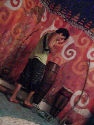 で、3時頃ナオヤさん登場。「練習始めるぞ」と二号館のリビングでリズム練習が始まったのでした。今日はまず、アドゴやスティックを持ってのアクセント練習。ナオヤさんが奏でるいろんなリズムについていくオイラ達。しばらくリズム練習をやった後、地下練習場へ行ってチンバウ練習開始。今日は二人ペアになって、交互にフレーズを打ち合うという練習をメインにやった。自分が叩き終わる際に、「ホィッ!」という掛け声を相手にかける。お互いの体内パルスを合わせるという意味で、こういった<太鼓を叩く以外>のコミュニケーションも大事だ、とのこと。
