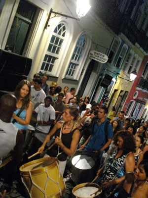 そして、火曜日の夜。音楽で溢れるサルバドールの街へと繰り出したのでした。スインギのサンバパレード目当てにペロニーニョの方に歩いていくと、なにやら人だかりが。大人数の打楽器隊編成のバンド演奏が行われていたのでした。ギター・ベース・ボーカルに物凄い数の打楽器がリズムをかぶせていく・・・かなりオイラ好みのバンド音でして。しばらく見入ってしまったのでした。いやぁ、サルバドール、吸収すべきモノがそこら中に溢れてますわ。