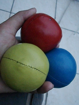 と、午後は、ひたすらそんな練習をナオ宿二号館のテラスでやっていたのですが、途中、息抜きにやってみた3ボールジャグリングにハマってしまいまして。ジャグリングを2年くらいやっているというウマくんが持っていたボールに触らせてもらったのが、キッカケとなり、30分くらい延々ボール投げに集中。いやぁ、楽しいですわ、これ。お手玉とは手順が違うんですよ。ボールを全て山なりの軌道で、左から右に、右から左に投げるという基本パターンが・・・難しくて。右手に持っていたボールを左手に、左手に持っていたボールを右手に移し替えるという、いわゆる一回しはなんとかできるようになったのですが、その後が続かない。これ、カーニバルまでにマスターしてみよっかな・・・と思うのですが、いやぁ、今は太鼓一本でがんばんなきゃいけない時期でしょ、と興味散漫な自分を戒めるオイラなのでした。