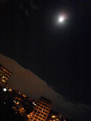 さて、今日も昨日とまったく同じ生活パターン。午前中、午後の二回の合同練習を終えると、もう、空にはまんまるな月が見えている。昨日も見たな、この風景。それにしても、一日があっという間に終わっていく・・・