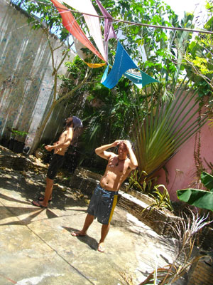 そんな熱い練習、練習中は上半身裸で、下半身は水着。なぜそんな格好かというと・・・練習後すぐに、中庭に出てシャワーを浴びるためなんザンス。気持ちいいんだなぁ、コレが。
