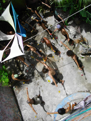 さて、街を練り歩くカーニバル、音はもちろんのコトとして、見てくれも大事だということで、スルド隊のみんなが、振り付けの練習をはじめている。いやぁ、盛り上がってきてますよぉ。