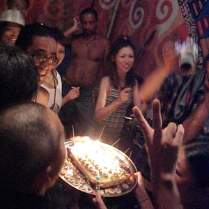 んでもって、今日、明日に誕生日を迎えるという、ウマくん、サトミさん、カッチャン、ミサさんを祝おうという企画が午後練習後にありまして。練習後、4人がリビングルームに上がってきたところで、皆でハッピーバースデーを歌いだし、クラッカーを鳴らして、ケーキを振舞うというビックリ企画を計画したのです・・・が、練習途中で、ビックリ企画準備中のリビングにミサさんが上がってきちゃったり、練習後、皆が先にリビングに集まって迎える計画のため、しばらく地下練習場に引きとめをしておくはずだったのに、ウマくんが一番初めにリビングに上がってきちゃったりして、一時はビックリ企画がグダグダになるかも、という危機が発生したのですが、そこは上手くフォローして、なんとか計画通りにビックリバースデー企画を決行。大いに盛り上がったのでした。