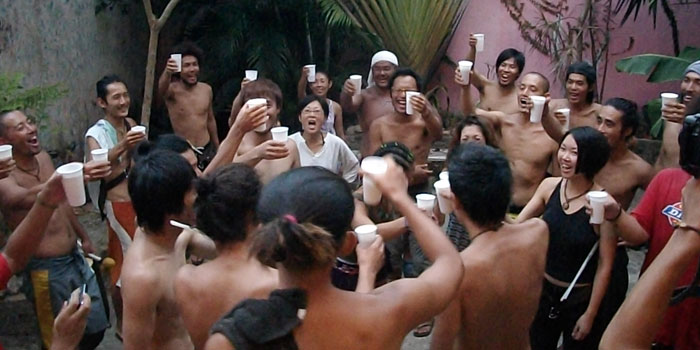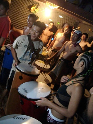 そして・・・4時になり、いよいよ、最後の練習。ナオヤさんが叩く<マラカ>そして、<ナタカトシア>のフレーズから怒涛の大合奏。いつもの二割り増しくらい気合の入った状態で皆叩く、そして踊る、揺れる。5曲をたたき終えた頃にはヘトヘト。そして酸欠状態。練習後、そのまま中庭に集合して、ビールが配られる。ナオヤさんの挨拶の後「乾杯!!!」