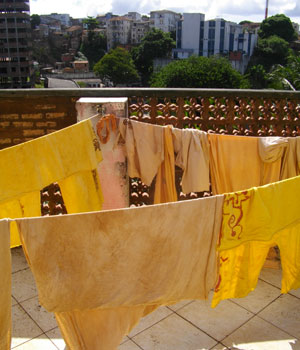 昨日の晩、染め上げた後、定着液に着け、外干ししていた衣装も乾き、当日にてギリギリ完成。そうそう、衣装は、基本的にボンフィンの時に作った衣装をベースに、切ったり、染めたりして使いまわしているんです。祭ごとに新たに作ったりはせず、再利用。地球にも、お金にもやさしい、エコなんです。