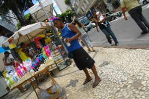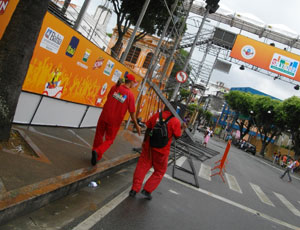 朝ごはんを食べ、早速街へと繰り出してみた。さぞかし賑わっているだろう・・・と思いきや、意外に街はまだ静か。昨日よりはデコレーションが進んでいたけど、まだ作業途中って感じ。ペロリーニョ、セー広場を抜けて、カンポグランジの方まで散歩してみたんですが、まだまだ祭前って雰囲気。オイラはこの雰囲気好きなんですけどね。嵐の前に、少しずつ街が高揚している雰囲気が。で、その作業風景で、気になったのが、通り沿いにならぶ店の入り口。どこもかしこも、ベニヤ板やら材木をトンカンと打ち付けているのです。祭の期間、特に、パレードが練り歩く通り沿いは大変なことになるようで、店の入り口をそのままにしておくと、メチャメチャにされてしまうようなのです。ベニヤ板や材木はそのメチャメチャにされるのを防ぐための予防策。う~ん、でもちょっとやそっとのガードでは、焼け石に水のような気もするのですが・・・