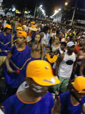 そして夜、ちょいとオフレコ事情なことがありつつ、カーニバルで盛り上がるカンポグランジへ。サルバドールのカーニバルは、主に3会場に分かれてパレードが開催されるんです。一つは、今日訪れているカンポグランジ。二つ目は、オイラ達が年明けを迎えたバーハ海岸沿いの道。そして三つ目が、<ナタカトシア>が練り歩くペロリーニョ周辺。この三会場をブロコと呼ばれるグループを一単位にして、カーニバルチームが演奏しながら練り歩くってワケなのです。このブロコ、大きなチームだと、大型のトレーラー車が先導して、その後に演奏隊が続きまして。そして、ブロコごとに、太い麻紐で囲われ、その麻紐を何人ものガードマンが持って一緒に移動し、演奏隊の中に、一般人が紛れ込むのを防いでいるんです。この辺、演奏者に配慮したシステムになってまして。イエマンジャの時に人で溢れる通りを練り歩いたゲリラライブは、ホント進むのが大変でしたもん。端の方で演奏してた人は、「オレにも演奏させろ」と目立ちたがり屋の地元人に楽器をしばしうばわれちゃったりして・・・まぁ、そういった地元の人たちとのフレンドリーなやりとりもパレードのオモシロさの一つではあるし、ナオヤさん的にも、日本人がここ、バイーアの地でパレードをやらせてもらっている中、入りこんでくる地元の人たちを排除して、日本人だけで盛り上がっているのはイヤみたいで、来るもの拒まずといった接し方で、これまでの二回のパレードは決行していたのです。