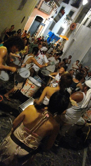 夕刻6時半に二号館に集合。皆テンションが高い。この時点で今までとは違った雰囲気が漂っている。さすが、本番。気合の乗り方が違います。結局出発は9時前くらいになっちゃったんだけど、その間もテンション落ちることなく、いい感じで出発。まずは本館前で軽く音出し・・・ってことだったんだけど、実際外で演奏を始めちゃったら、もう気分が盛り上がっちゃって。皆この時点で全力投球。熱い演奏が始まっちゃったのでした。そのままいつもお世話になっている屋外ビアバー<アオゾラ>の前を演奏しながら通り、メイン会場であるペロリーニョへ。ペロリーニョで、他のチームの人たちや観光客と騒ぎながら、しばらく待機。そして・・・アフロカツラをかぶり、いつもに増して気合の入ったナオヤさんのチンバウ演奏が流れ出す。それに続いて叩きだす、チンバウ、ヘピ。そしてナオヤさんのカウント指示でメイヨ、フンドが低音を刻み始める。ペロリーニョの会場を練り歩き開始。早くも踊りだす観客たち。外で叩くと音がクリアに抜けて聞こえるのが気持ちよい。そして、キメ。今まで以上にビシッと決まるキメ。き、気持ちいい!自分達のテンションが上がると、周りのテンションも上がってくる。そして、そのバイブスで、さらに自分達のテンションがあがってきて・・・上がりっぱなしのテンションスパイラル。ヤバイっす、コレは。