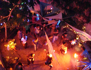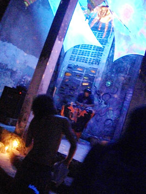 さて、そんなまったりとした午後を過ごしている今日、夕刻からおそらく明日の明け方くらいまで、ナオ宿2号館にて、トランスパーティが開催されることになっているのです。昨日のオツカレーに続く、カーニバルのアフター第二弾。オツカレーの後から、中庭がトランスパーティ仕様にデコレーションし始められ、3時過ぎには、アンプやら、DJブースが立ち並び、すっかりパーティ会場に変貌。5時くらいから、タツヤさんが回し始め、音が鳴り始めた。オイラ、トランスとか普段はまったく聞かないし、ましてや踊るためにクラブに行ったりすることもないんですけど・・・以前、日本で、映像関係にハマっていたころ、友人でVJをやっている人たちがいて、お手伝いがてら、クラブに出入りしていた時期はあったんですよ。まぁ、やっぱりトランスの音楽とか好きにはなれなかったので、だんだん足を運ばなくなっちゃったんですけど。