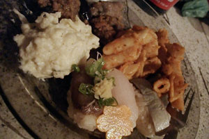 というワケで、久々のトランス。ビールを飲んでちょっと酔ってるくらいで、踊るのは気持ちいいですな。んで、ちょいと踊ったらお腹がすいたので、この日のために昨日の晩から仕込んでいたというユキ君、AK君の作ったプレート料理をいただく。これ、寿司やら、スナギモのフライとか、マーボー茄子とか、ポテトサラダとかが盛ってある超豪華プレート。一皿10レアルで販売しているんですが、まぁそれだけの価値は十分あるお味。日本で料亭料理をやっていたというユキ君の味つけは、絶妙でして。いやぁ、味がきちっと締まっている料理を久々にいただきました。オイラが料理すると、どうしても大味になっちゃうんだけど、ユキ君の料理って違うんですよ。使っている食材やら調味料の一つ一つが絶妙に絡み合っていて。しかも、それぞれが主張しすぎることなく、それでいて、際立っている。さすがプロの味です。