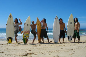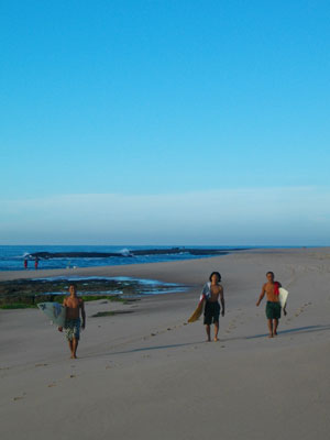 しばらくして、コウくんが休憩であがってきた。で、ボードを貸してくれるというので、オイラもちょいとサーフィンに挑戦してみることに。ウマ塾長から、パドリングとドルフィンのやり方を習い、いざ海へ。今日は比較的波が穏やかだったので、なんとかいい波のある沖へ出ることができ、さぁ波に乗ろうと思ったのですが、これが・・・乗れない。波が崩れる直前の白波の前のポイントに、パドリングでこぎつけ、その勢いでエイやとボードに乗っかる、と、頭で流れは分かっているのですが、乗れないんです。4人の格闘ぶりは見ていたものの、ブラジル人の上手い人が、あまりに簡単そうにやっているので、すぐにできるんでしょ、サーフィンとか思っていたら、やっぱり、そんなに甘いものじゃなかった。二転三転と波に飲まれつつ波を待ち、コレだと思った波が来ても、パドリングが上手くいかず、波においていかれ、たまに、乗れたかもと思っても、それはホンの一瞬だけで、次の瞬間には、海の中・・・あはは、これはやっぱり二週間くらいミッチリやらないと、ダメみたいです。とりあえず、1時間弱のサーフィン初体験は、苦い思いのまま終了となったのでした。