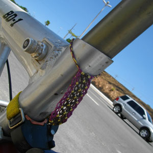 オイラは1泊だけさせてもらって、今日もうサルバドールへ戻るんで・・・みんながお昼寝タイムに入る前に、おいとますることに。別れ際、アルテサニアであるウマくんに弟子入りし、小物作り修行をしているコウくんから、2作品目を、プレゼントしてくれたのです。ありがと~コウくん。早速、お守りとして自転車にとりつけて走ることにするよ!