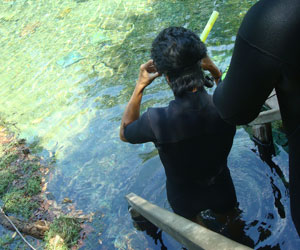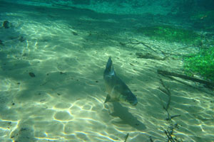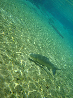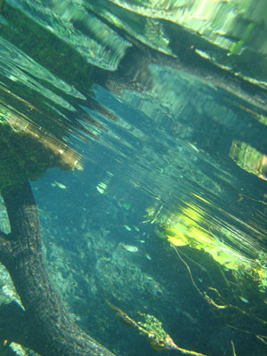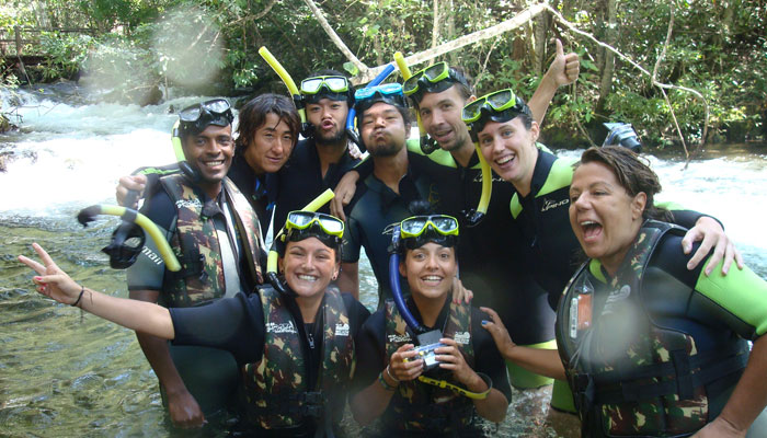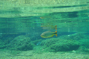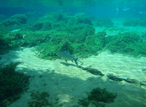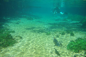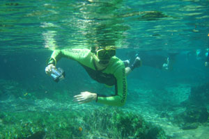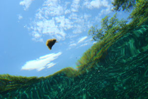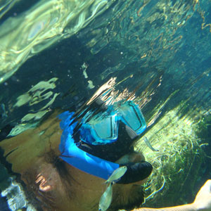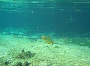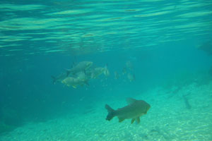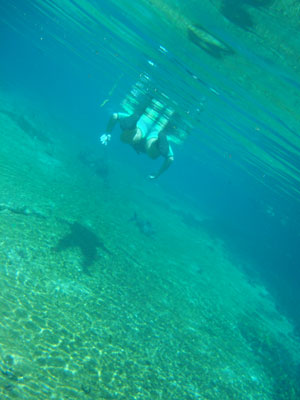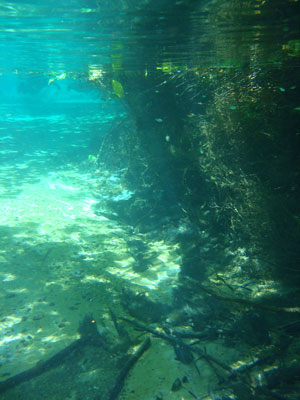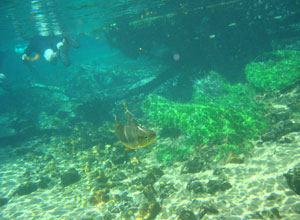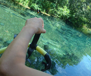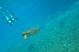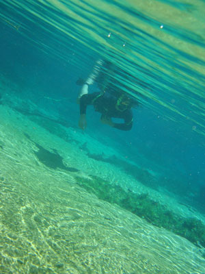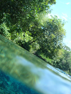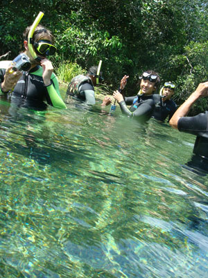 そんな愉快な仲間達と向かったプラッタ川。施設のエントランスでしばらく待たされた後、ウェットスーツを着て、ジープへと乗り込む。未舗装道路をガタゴト進んだ後、降ろされたところから、さらに歩くこと40分。ようやく見えてきた川は、見事に澄みわたっていた。ホントに、驚くほど透明な川の水。透明度を保つため、川底には足を着かないこと、といった注意書きを読み、いざ水中へ。とりあえず、川に浮くということに慣れるため、テストコースらしき場所をグルッと一周することに。まずは手慣らしかぁ、と水の中に入ってみて、ビックリ。テストコースといっても、ここは、プラッタ川の一部。色とりどりの大小さまざまな魚達がそこら中に泳いでいる。なんつーか、水があまりにも透明すぎるため、実際中に入ってみると、水の存在を忘れてしまう。魚がまるで、宙を浮かんで動き回っているのではなかろうか、という錯覚に陥るほど。写真に撮っちゃうと、青みが強くのっちゃうけど、肉眼で見た水の中は、いや、驚くほど、クリアな世界。テンションがアッという間にあがっていきます。シュノーケル自体は、簡単に慣れられます。川の流れも緩やかだし。テストコースでも、十分なくらい透明な水の世界を堪能し、一旦、浅瀬で足を着ける場所に集合。もうみんな慣れたってことで、いよいよ、本格コースへ。泳ぎ始めた本格コースが・・・これまた、さらに透明度が高くて、ビックリ。いやぁ、これは、楽しすぎる。川に流れがあるため、ただ浮いているだけで、体は流され、目の前の風景は移り変わっていく。次第に、何も考えなくなり、ただ、水の中の世界に没頭するようになる。この時、オイラは完全に魚になってました。魚男。なんか、人間である自分を忘れさせるアトラクションって凄くないですか?川の流れの中という、普段の物理空間とは大きく異なる力学空間に身を任せているせいなのでしょう。とにかく、人間であるという感覚すら消し去ってしまう、ものすごいアクティビティです、これ。